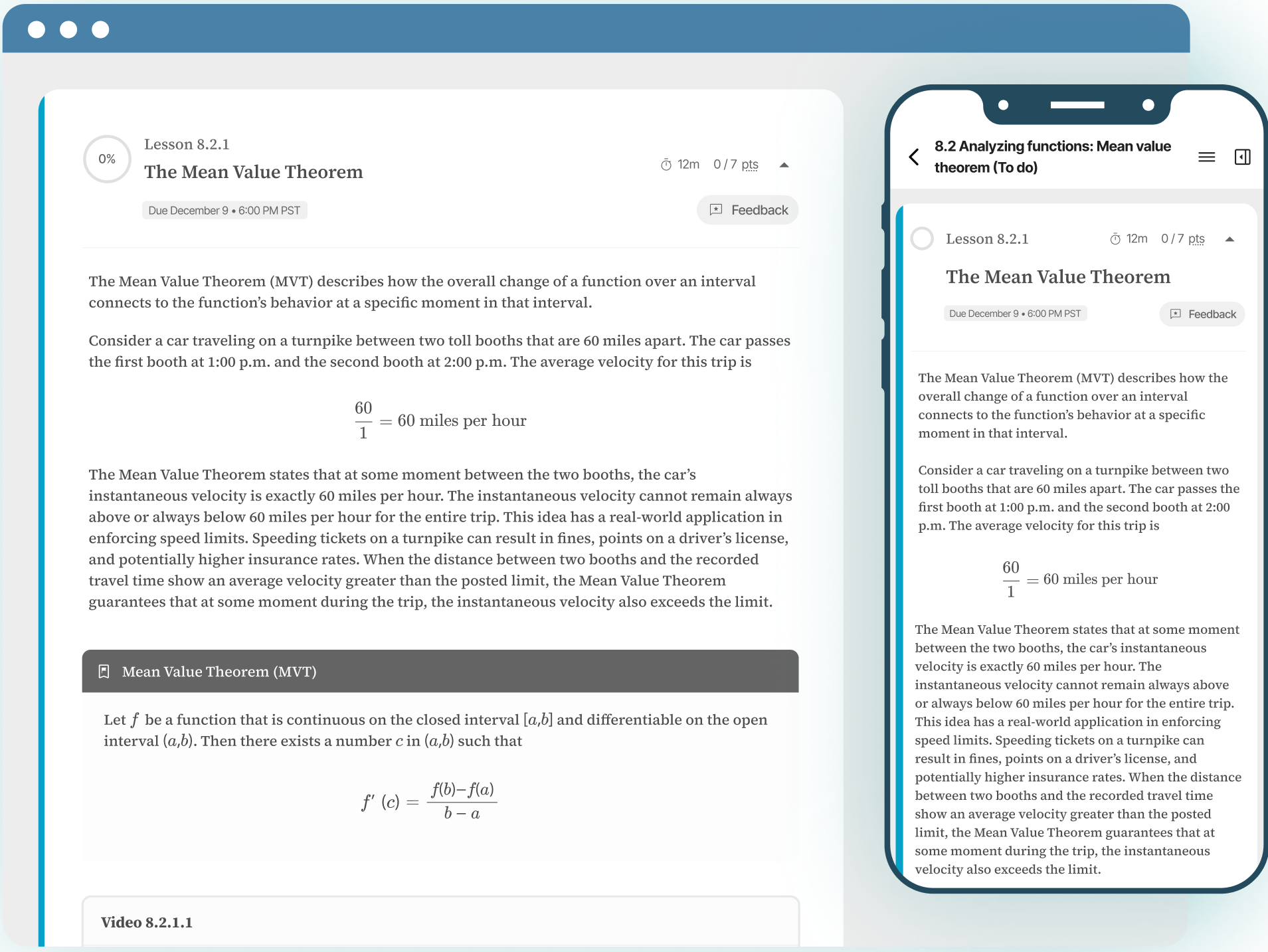 Short, scaffolded modules break concepts into focused 10-minute activities. Each activity is interactive and provides immediate feedback. A content-aware AI tutor offers help at the moment of confusion, while auto-graded homework and practice quizzes promote mastery through unlimited retries and solution paths.