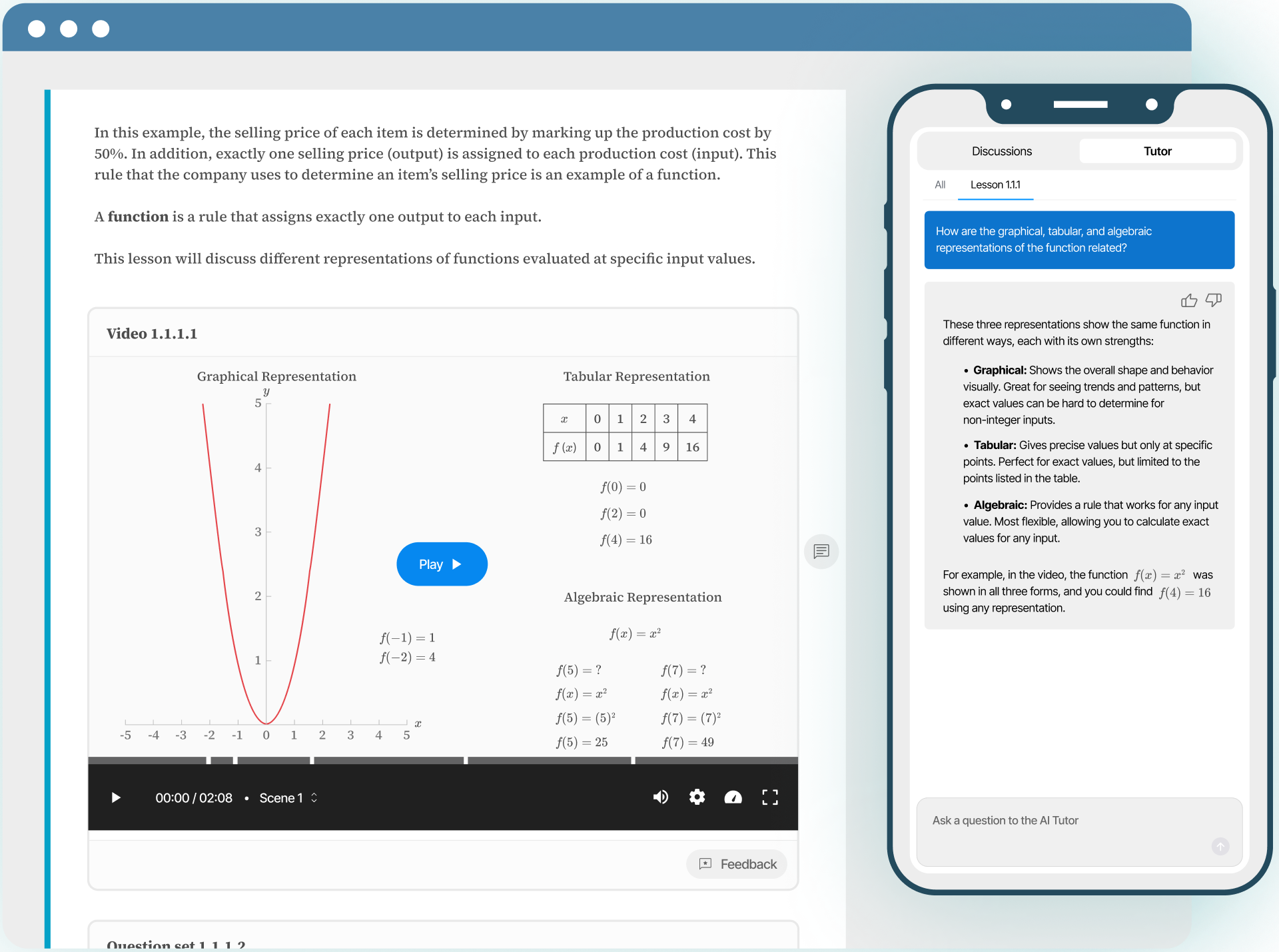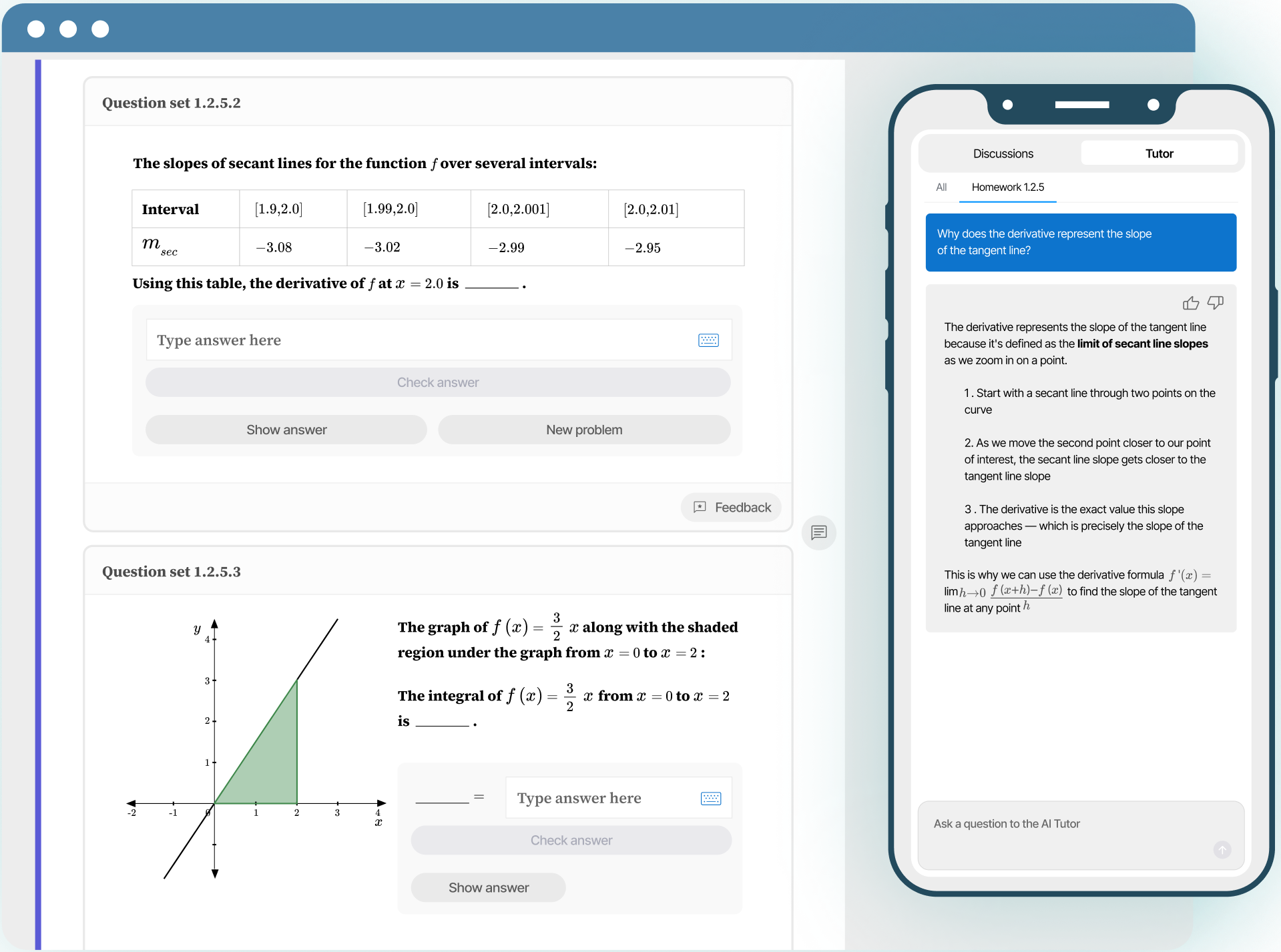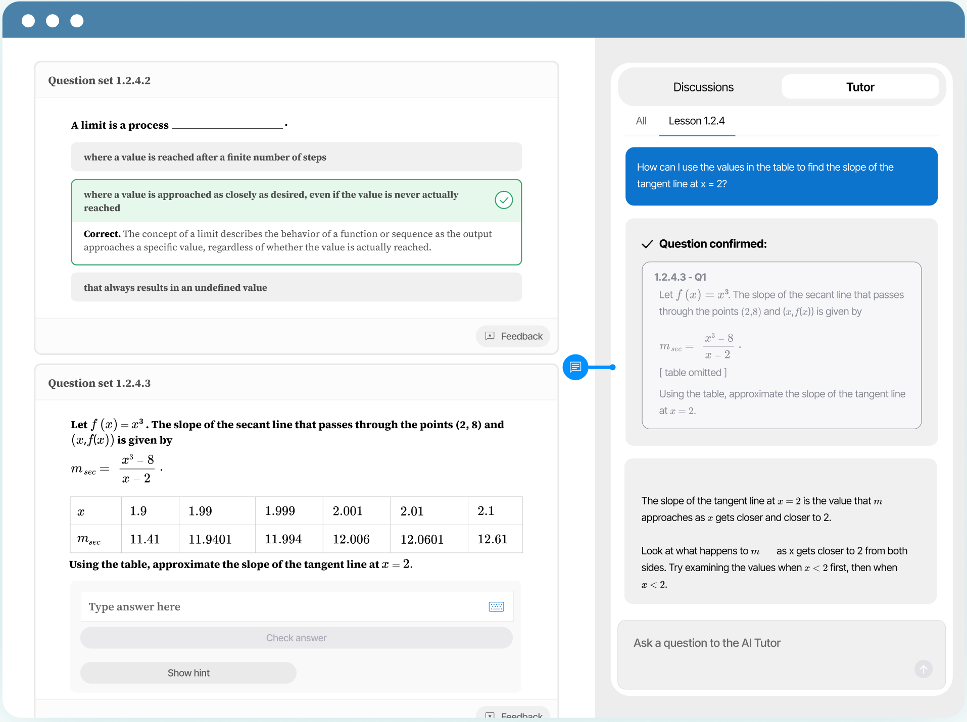 Students learn through short, scaffolded activities that build incrementally and are reinforced by auto-graded practice, solutions, and unlimited retries. A content-aware AI tutor and connected discussion forum provide timely help, while the courseware balances conceptual understanding with procedural fluency.