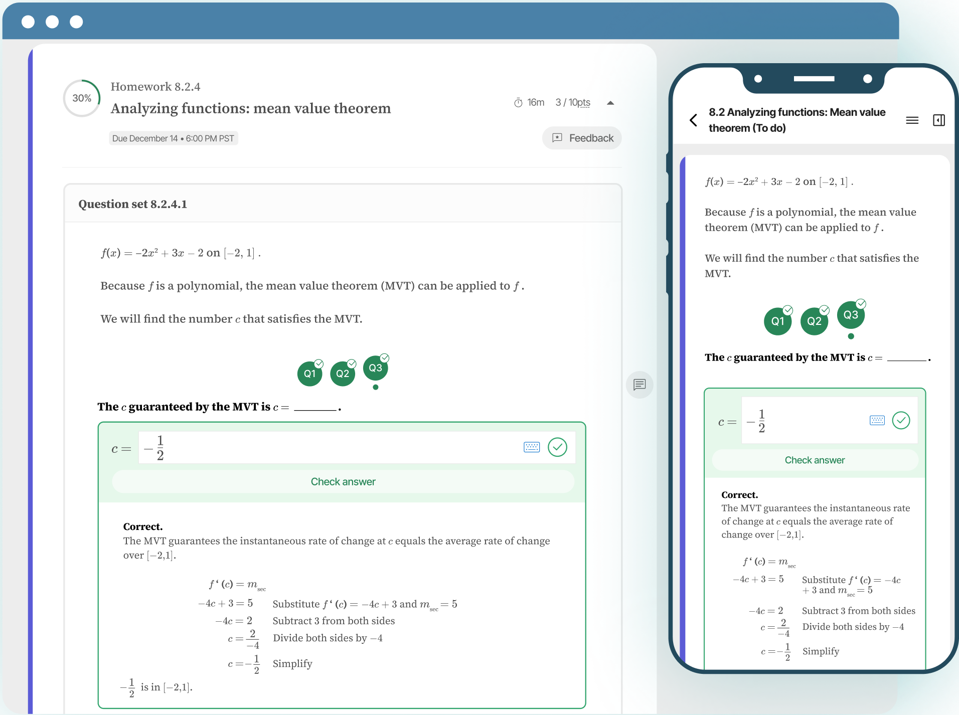 Completed after class to reinforce concepts through aligned practice, auto-grading, unlimited attempts, and worked solutions.
